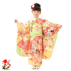 【レンタル】七五三 着物 7歳 フルセット レンタル 7歳女の子 753 女児 四つ身 子供 お祝い着 正月 新品足袋プレゼント 往復送料無料7girl-k840 芦田愛菜 黄緑色 丸梅鞠ウサギ 裾グラデーションオレンジ