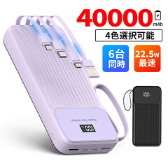 モバイルバッテリー 大容量 軽量 40000mAh 6台同時充電 22.5W 急速充電4つケーブル内蔵 残量表示充電器 防災グッズ iPhone 対応 ひも付 落下防止 便利グッズ 持ち運び便利 PSE認証品 旅行/出張/防災/地震対策/停電 送料無料