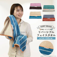 リバーシブル フェイスタオル 綿 100% 34×80cm コットン タオル ストライプ 無地 ループ付 吸水 パイル 無撚糸 おしゃれ かわいい ギフト プレゼント 子ども コンパクト 送料無料