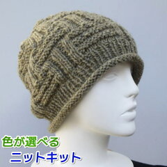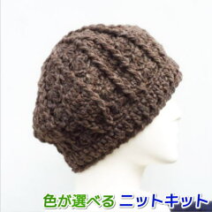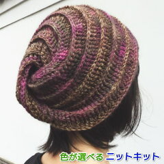 かぎ針編みで台形型に編み、それをねじるようにとじ合わせることで、ユニークなデザインが完成。ねじりを横にして被れば、ターバンとしても楽しめます。無料編み図と着分毛糸がセットになっているので、手軽にかわいい帽子が手に入ります。