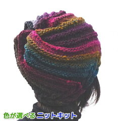 オリムパスの「メイクメイク」は、その名の通り、編むだけで表情豊かな模様が生まれる人気の段染め毛糸。このキットでは、この「メイクメイク」を使って、ターバン風のねじりが可愛い帽子を編むことができます。